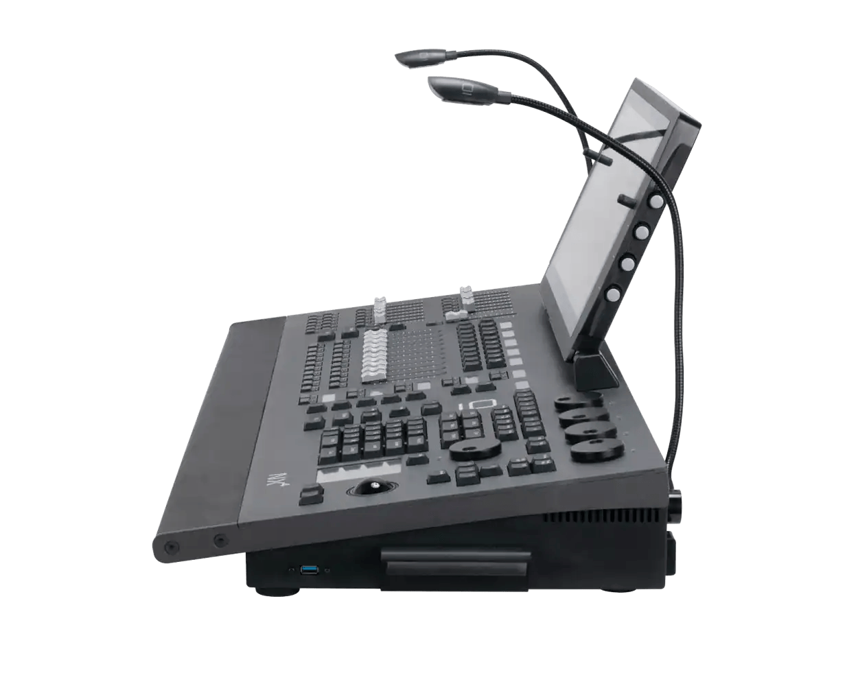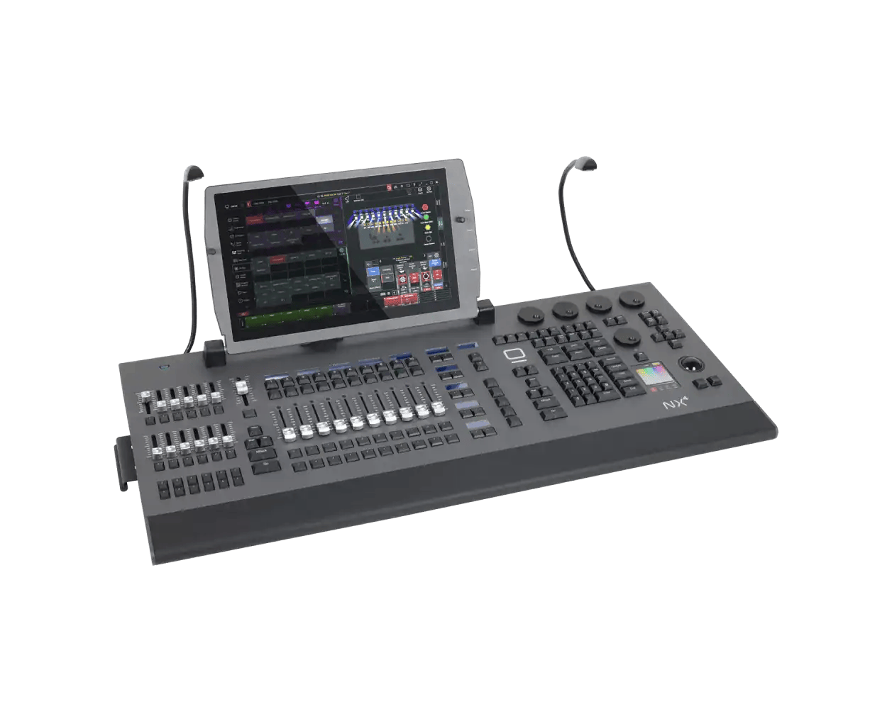 At the other end of the spectrum, the NX4 is a fully standalone lighting control console designed for mid to high-end production environments. It offers an all-in-one hardware/software solution with an integrated processor, touchscreens, and high fader/encoder counts.