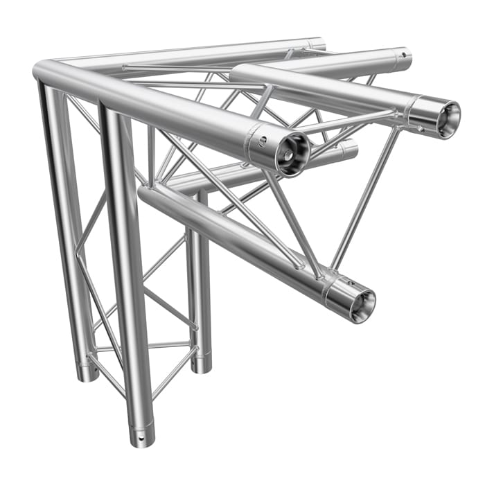 The TS223-3WL 3 way 90° corner suits 290mm spigot tri trusses. Has 3 hollow 35mm chords of 1.6mm wall thickness and 20mm braces.