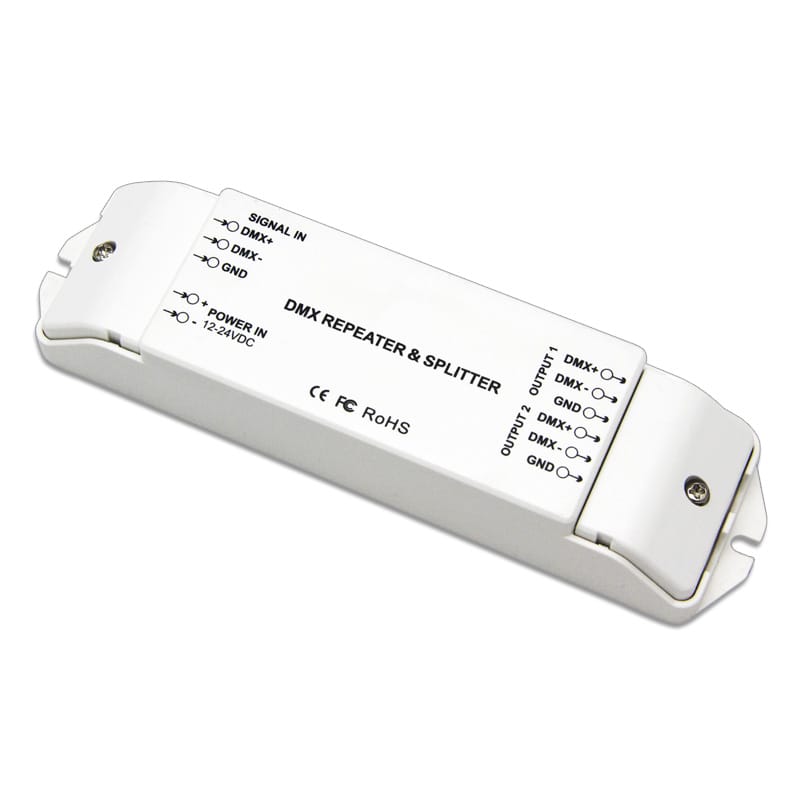 This device has two output channels and it features optical isolation between input and output (each interface has an independent electrical isolation. Furthermore, there is wrong wiring protection at DMX input and output port, to avoid interference to the DMX512 control system, plus it guarantees that the DMX signal can transmit to all the lighting control equipment, and it improves the overall reliability of the lighting control system.