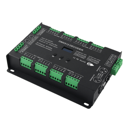- Input: Standard DMX512 signal; 3-digit display shows DMX address code.